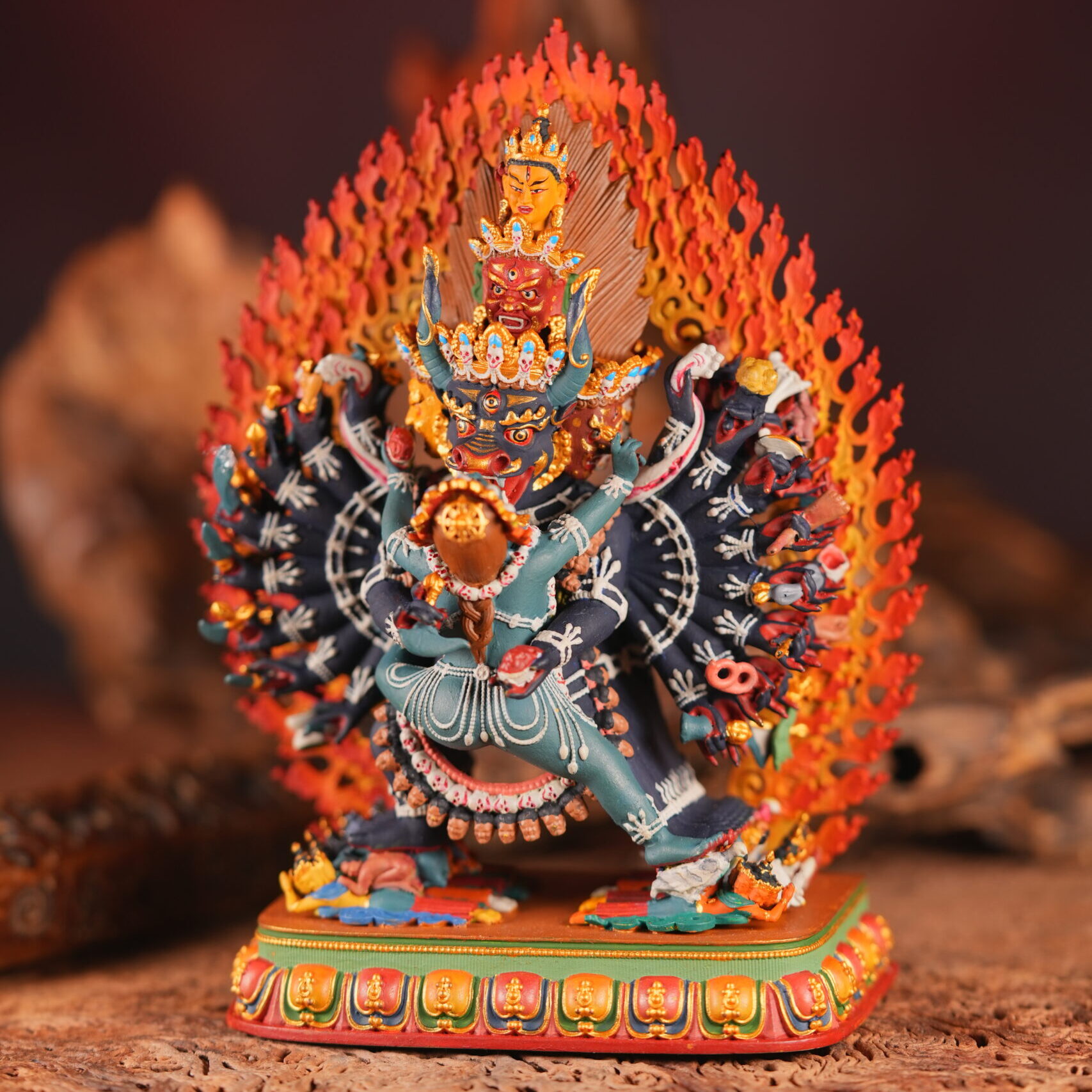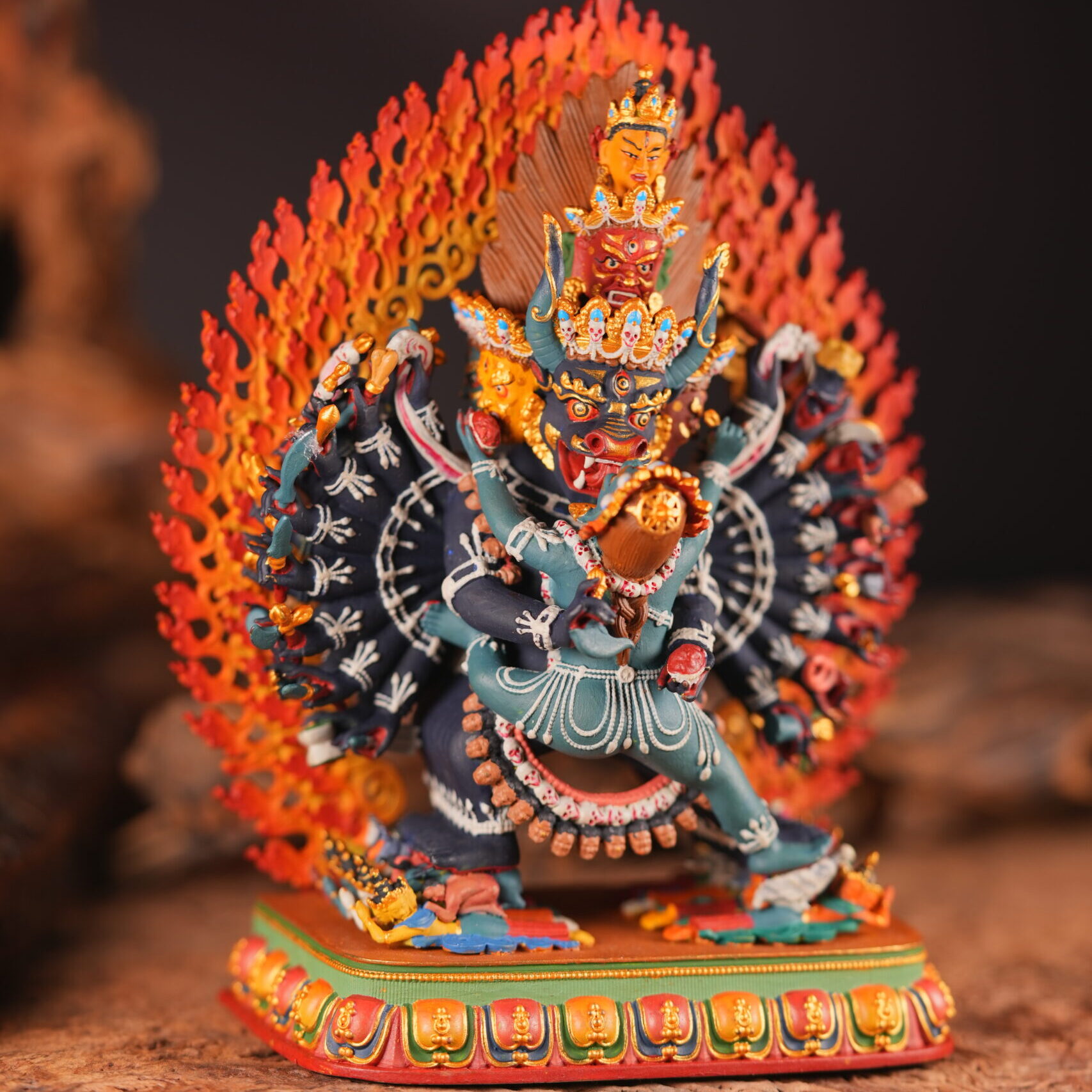 Vajrabhairava (“The Ultimate Terrifier”), wrathful embodiment of Manjushri’s wisdom, manifests in union with consort to dismantle ignorance. This primordial embrace symbolizes: