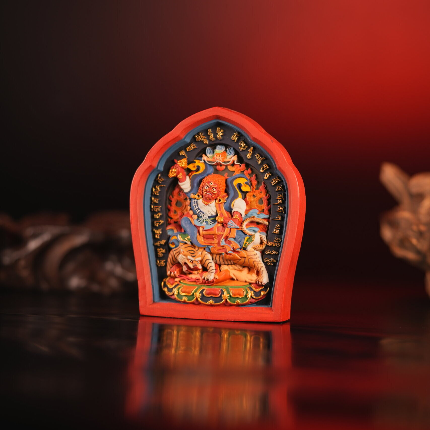 In traditional imagery, Dorje Trolo is depicted riding a tigress, a motif that is widely interpreted as symbolizing the mastery of raw, untamed forces through awareness and discipline. The flames, fierce gaze, and energetic stance are visual elements used to convey momentum, resolve, and decisive action as expressed through iconographic form rather than literal narrative.