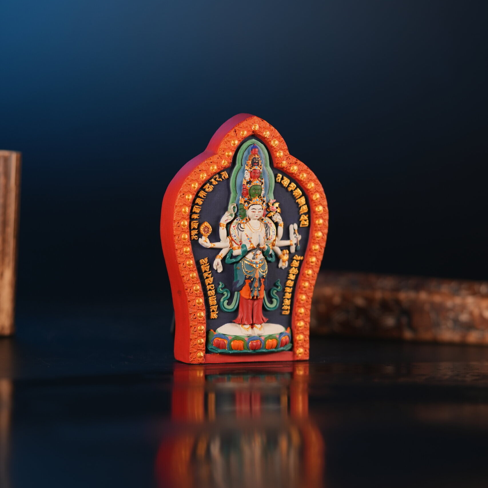 Ekādaśamukha Avalokiteśvara, the Eleven-Faced and Eight-Armed form of the Bodhisattva of Compassion, embodies the infinite capacity of awakened mercy to perceive and respond to the suffering of all beings. His eleven faces gaze in every direction, representing the omniscient awareness that sees every cry of distress, while his eight arms symbolize the skillful means through which compassion manifests in countless forms of aid and protection.