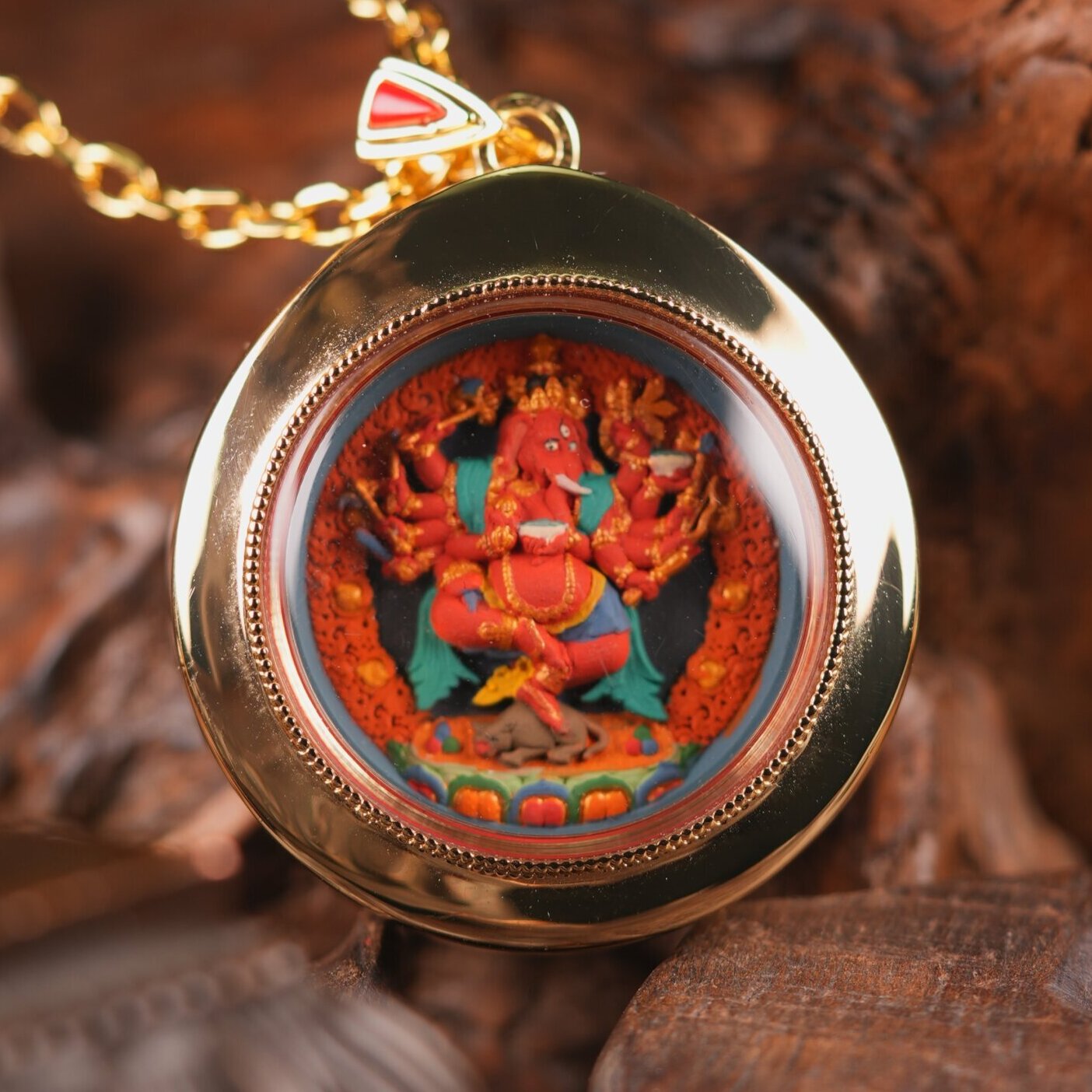 Ganapati, known as the Elephant-Headed Deity of Wisdom and Prosperity, is revered in both Hindu and Vajrayana Buddhist traditions as the remover of obstacles and the guardian of auspicious beginnings. In Tibetan Buddhism, he is honored as a wealth deity who grants both material abundance and spiritual accomplishment. His elephant form symbolizes strength, intelligence, and the steady power of mindfulness that clears the path toward success and realization.