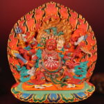 Hayagrīva (Tamdrin), the three-faced and six-armed wrathful deity, is revered in Vajrayana Buddhism as the fierce embodiment of enlightened compassion in action. Manifesting from Avalokiteśvara (Chenrezig), he embodies the same compassionate essence but in its most dynamic, protective form — destroying disease, subduing malevolent forces, and transforming delusion into wisdom. His neighing horse’s head, emerging from his crown, symbolizes the sound of truth that pierces through ignorance and fear across all realms.