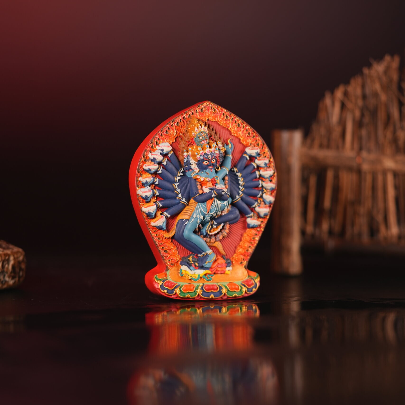 Hevajra, the Supreme Lord of the Tantric Path, manifests in Yab-Yum (father–mother) union with Nairātmyā, the wisdom consort of selflessness. Together, they embody the inseparable nature of bliss and emptiness — the ultimate realization that all phenomena are pure expressions of enlightened mind. His fierce countenance and dynamic embrace symbolize the unification of method and wisdom, compassion and insight, appearance and ultimate truth.