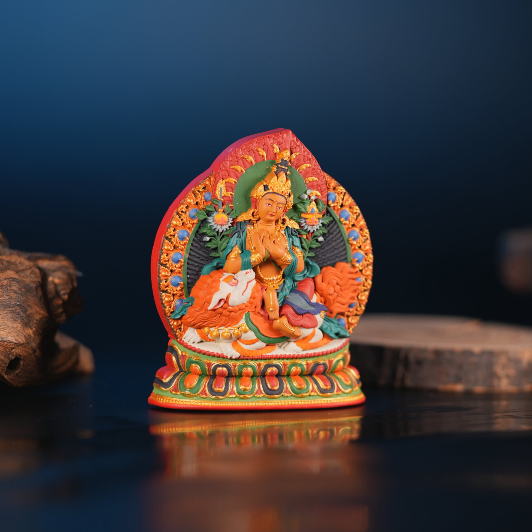 Manjushri, the Bodhisattva of Wisdom, is portrayed here riding upon a majestic lion — a symbol of courage, truth, and the unstoppable power of awakened intelligence. His mount represents the fearless strength of wisdom that dispels ignorance and conquers delusion, while his calm and radiant expression reflects the serenity born of perfect understanding.