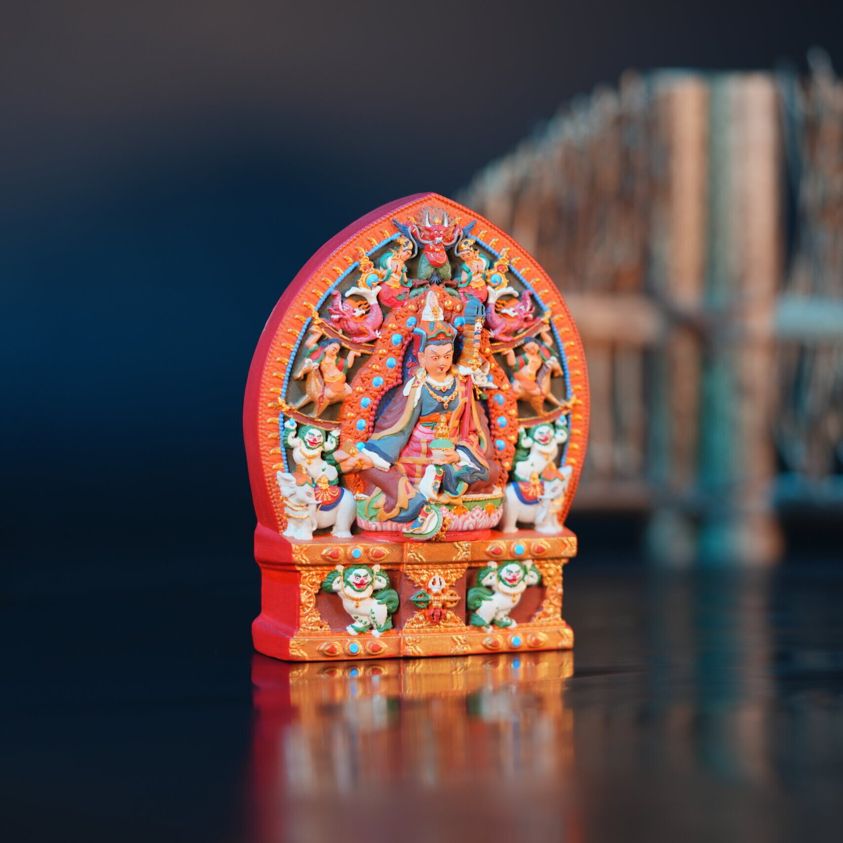 Faithfully modeled after rare early Tibetan prototypes, this votive Tsa-Tsa revives the sacred iconography of the Lotus-Born Master, revered as the Second Buddha of Tibet. His serene countenance reflects omniscient wisdom, while his gesture of blessing and his tantric regalia embody mastery over both samsaric and transcendent realms.