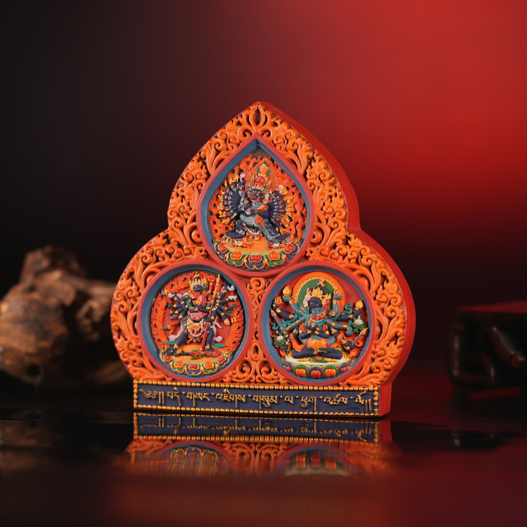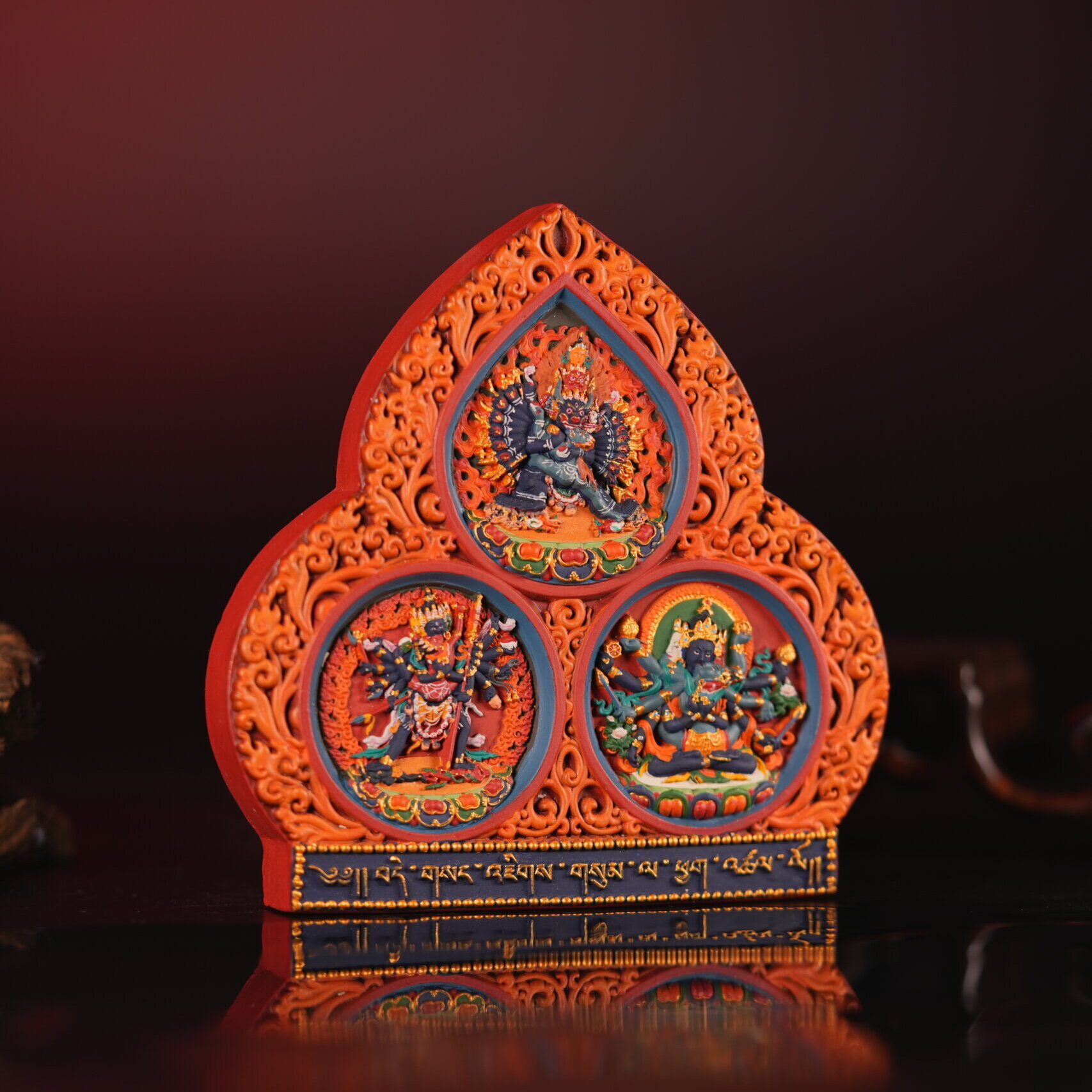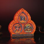 This piece is presented as a cultural and artistic representation, valued for its intricate painted surface, sculptural depth, and faithful adherence to classical multi-figure compositional models preserved in Tibetan visual tradition.
