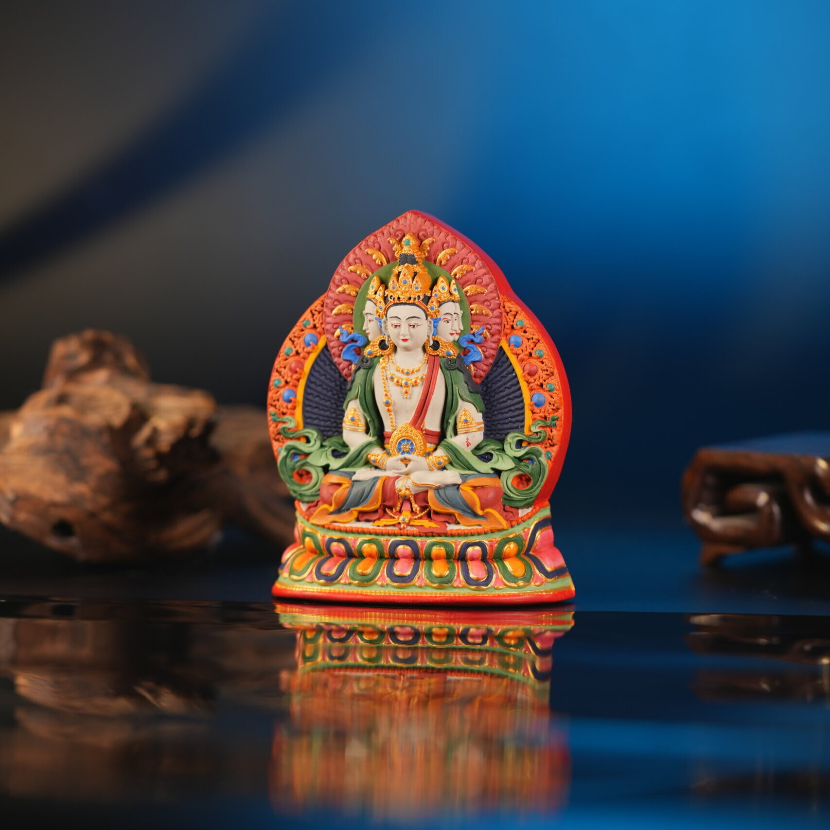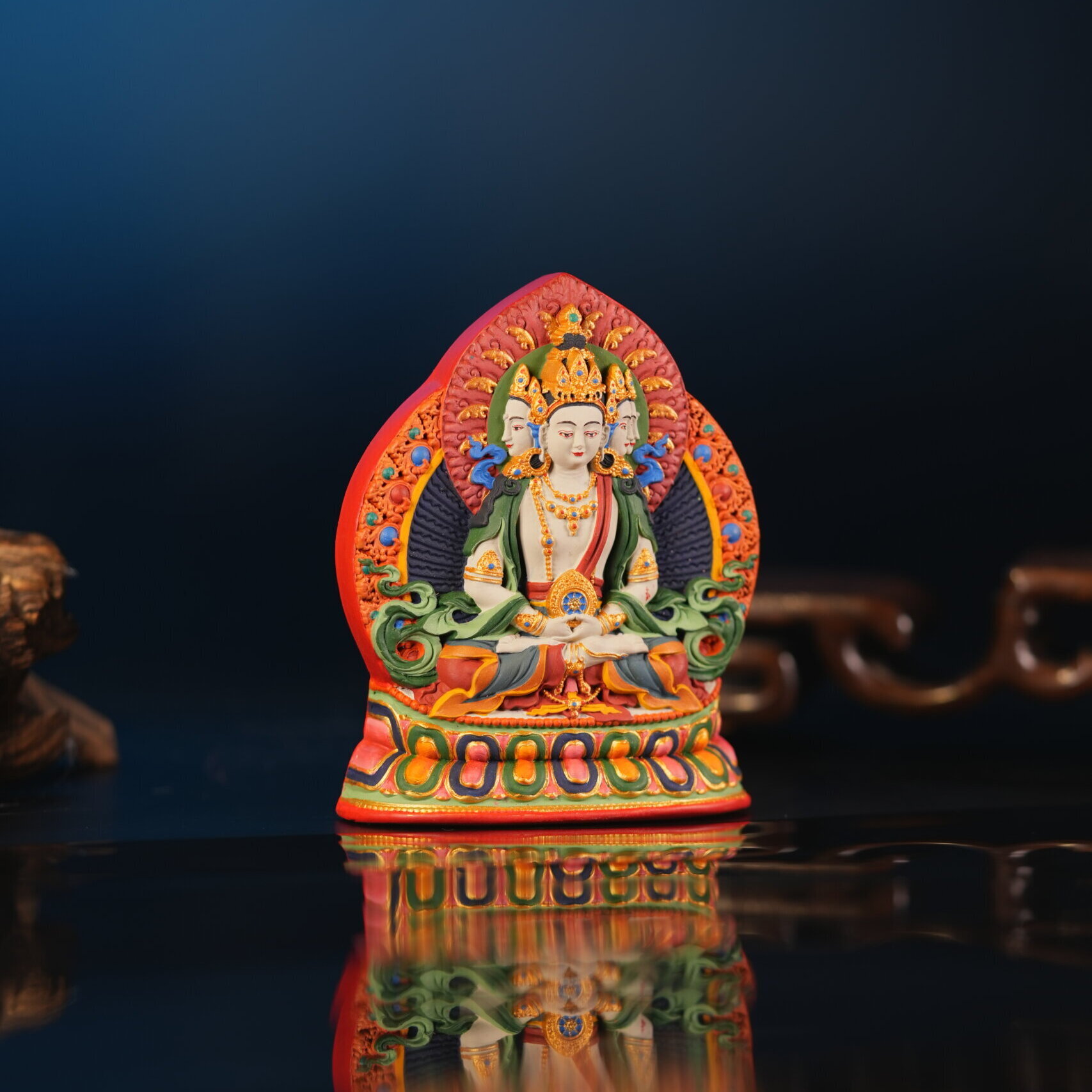 This 10.2 cm large votive Tsa-Tsa is presented as a cultural and artistic representation inspired by established Vairocana imagery. Valued for its compositional clarity and symbolic depth, the piece reflects long-standing artistic interpretations of balance, illumination, and universality within Tibetan art traditions.